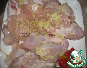 Натираем имбирь на крупную тёрку и хорошо перемешиваем с куриным мясом, даём постоять минут 30