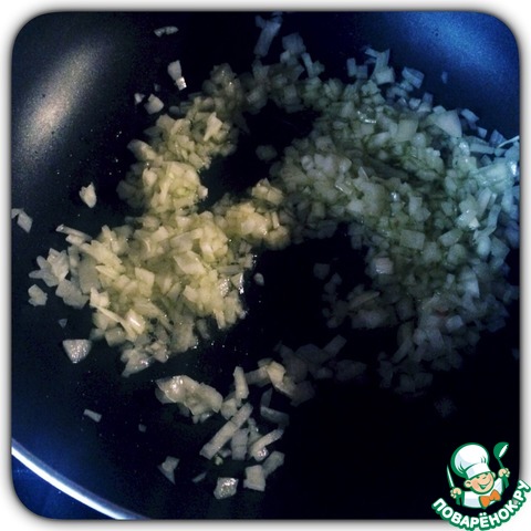 Когда курица сварилась, вынимаем ее из бульона и остужаем. В это время режем мелко лук и обжариваем его на оливковом или растительным масле до золотистого цвета.