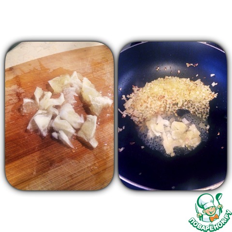 С половины лимона (можно и целый, но это на любителя кисленького) снимаем шкурку, а мякоть режем. Отправляет к обжаренному луку.