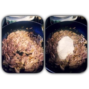 Кусочки курицы отправляем к луку с лимоном. Быстро обжариваем, добавляем карри, сметану и немного бульона от курицы (или воды). Тушим до испарения не всей жидкости. -