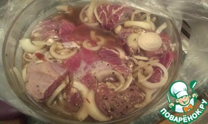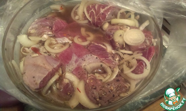 Маринуем мясо: режем мясо примерно одинаковыми кусочками, лук, добавляем перец, уксус, воду.
