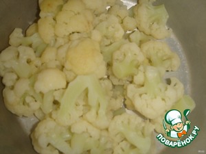 Цветную капусту разобрать на соцветия, отварить до полуготовности (буквально 3-4 минуты) в кипящей подсоленной воде и слить воду.