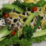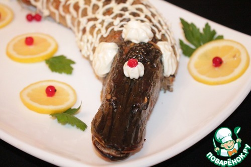 Сверху накрываем фольгой, места стыков скрепляем. Фольга не должна касаться рыбы сверху. Зубочисткой прокалываем фольгу по поверхности, чтобы выходил воздух, резкими движениями. Отправляем в духовку на 180 град. на 1 ч. 30 мин. Затем аккуратно, очень горячий пар, снимаем верхний слой фольги и оставляем в духовке еще на 30 мин., до появления золотистой корочки. Рыбку достаем, если Вы хотите подать ее как горячее блюдо, то аккуратно выкладываем или в противне нарезаем порционно. Если Вы хотите подать рыбку как закуску, то немного остужаем в противне. Затем берем лопаточку, тонкую, у меня от мультиварки, проходим по дну рыбы. Делаем это для того, чтобы в процессе остывания рыбка не прилипла к фольге. Очень аккуратно там, где хвостик, он очень сухой. До конца остужаем в холодильнике. Украшаем по желанию, но присутствие майонезной сетки смотрится красиво, не переусердствуйте с украшением, это отвлекает от рыбы. И еще одно немаловажное добавление, это очень бюджетное блюдо, которое по своей стоимости очень недорогое. Обязательно попробуйте.