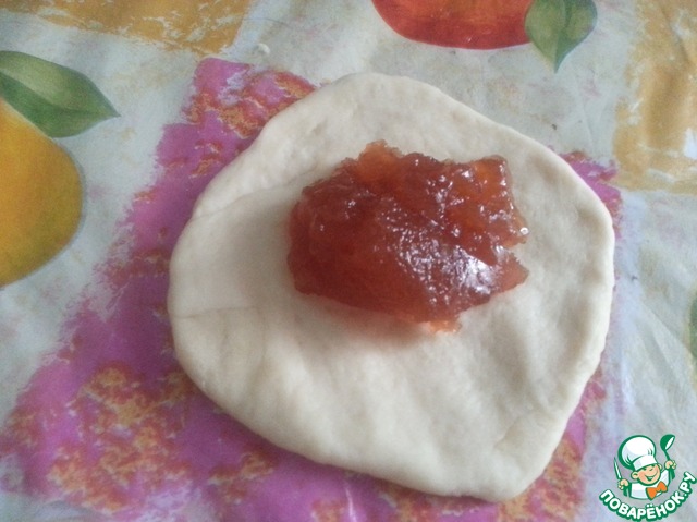 Отрываем от теста небольшой кусочек, разминаем руками в лепешку. В центр каждой лепешечки кладём любимый джем.