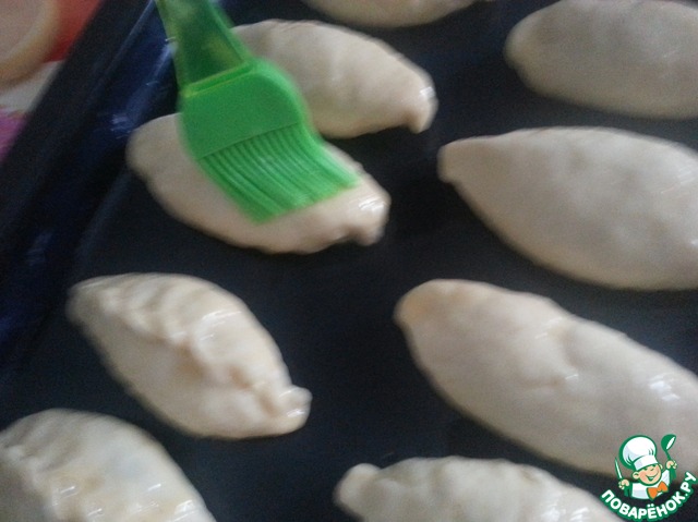 Пирожки накрыть полотенцем и поставим еще немного подойти. Затем смазываем яйцом и отправляем в духовку. Выпекаем в температуре 180*С около 15-20 минут.