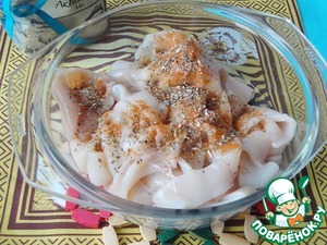 Посыпьте кальмры смесью специй и перемешайте.