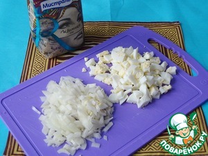 Очистите и порежьте лук и яйца.
