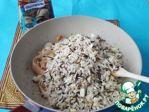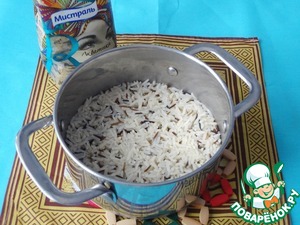 В этом блюде я использую рис ТМ Мистраль Акватика MIX. Он варится минут 30-35 в соотношении сводой 1:2.