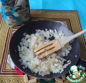 Пассеруйте лук до прозрачности.