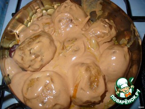 В кастрюльку выложить овощи, затем тефтели, залить соусом, аккуратно перемешать, довести до кипения и тушить на небольшом огне 10 минут.