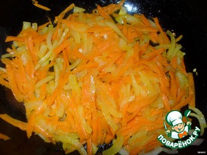 Морковь и лук почистить, лук нарезать четвертинками колец, морковь натереть на крупной терке. Потушить в растительном масле.