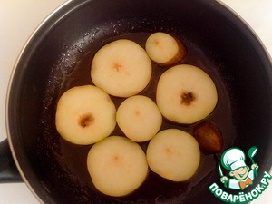 В карамель положить колечки и верхушку груши. Карамелизировать 1-2 минуты с каждой стороны.