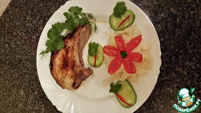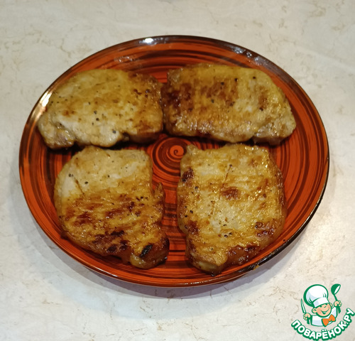 Мясо пожарить на смазанной оливковым маслом сковороде (хорошо прогретой), с каждой стороны по 3,5 минуты (огонь средний). Всё зависит от того, какой толщины кусок мяса и где вы купили свинину.