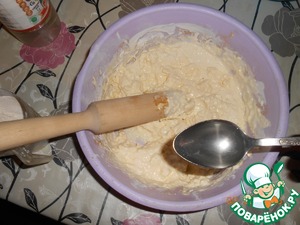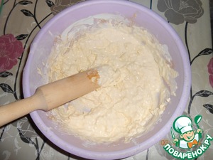Постепенно подсыпаем муку сметану и ванилин. Муки надо 2-3 стакана (сколько возьмет) у меня пошло два мерных стакана.