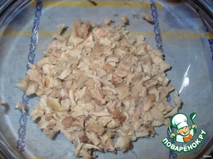 • Окорочка вынуть из бульона (его оставить на первое), отделить от костей, мясо мелко нарезать.