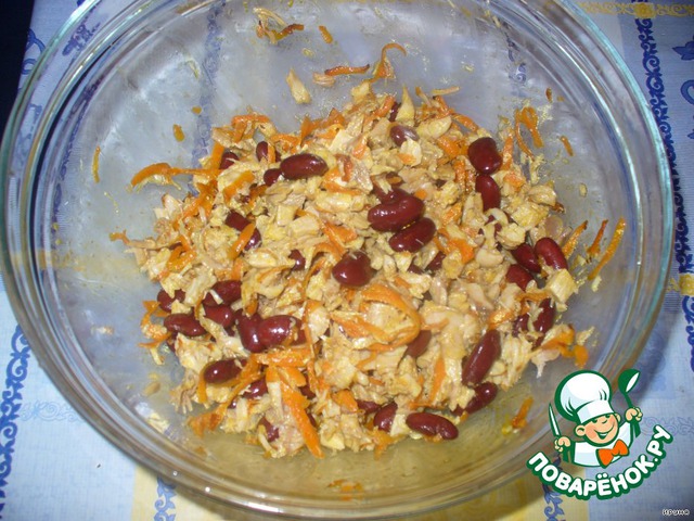 • Куриное мясо, фасоль без жидкости и морковь с чесноком соединить и хорошо перемешать.