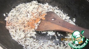 На сковороде нагреть масло и обжарить рис. Добавить щепотку корицы и перемешать.