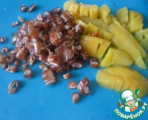Пока варится рис, нарежем на мелкие кусочки финики и манго. Подмешаем их в плов.