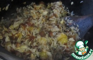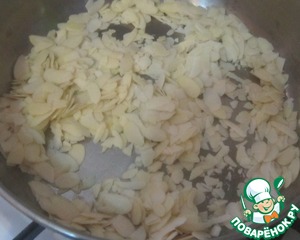 Обжарим на сухой сковороде миндаль, дадим остыть и добавим в плов.