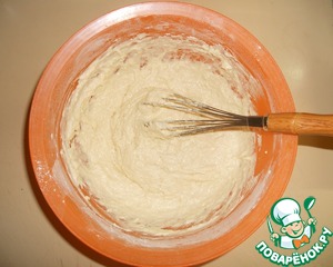 Взять венчик и перемешивать все в одном направлении до тех пор пока не получится однородное густое тесто. Главное - больше не добавлять никаких ингредиентов и перемешивать только в одном направлении. Не бойтесь, что тесто может получиться очень густым. Тесто готово - больше ни в коем случае не пытайтесь перемешивать, не надо тревожить тесто.