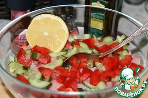 В глубокой миске смешать овощи и рыбу. Добавить сок лимона, соль, перец, масло. Я факультативно добавила сухие травки. И очень аккуратно перемешать.