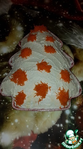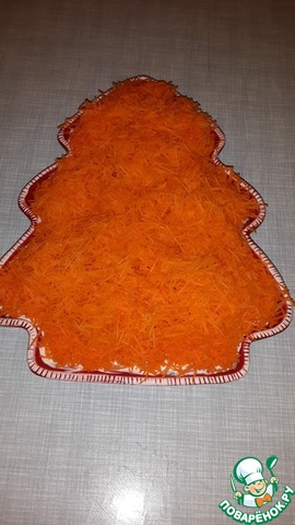 9. Так как салат готовился к Новому году, я взяла блюдо в виде елочки и сверху украсила оставшейся натертой морковкой. Обычно обхожусь без украшений и беру круглое блюдо. Все, салат готов, теперь нужно убрать его в прохладное место минимум на час, чтобы пропитался. Я обычно готовлю его часов за 5-6 до торжества. Морковка за это время может выделить сок (если она очень сочная), если он вас смущает, можете аккуратно слить, или промокнуть по бокам салфеткой, но я обычно оставляю, так вкуснее. Салат получается очень нежного и сочного вкуса.