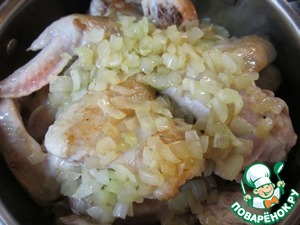 Курицу нарезать на куски, обжарить на растительном масле и уложить в кастрюлю.