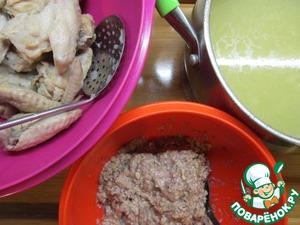 Как курится сварится, вынуть ее из бульона. Бульон остудить до температуры, чтоб не сварилось яйцо. Постепенно доливая бульон в соус, смешать соус с бульоном.