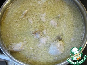 Уложить в кастрюлю курицу и бульон с соусом.
