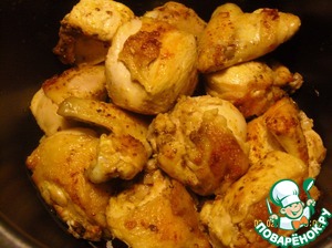 Курицу (мясные части) посолить, приправить и обжарить на масле, переложить в казан (утятницу)