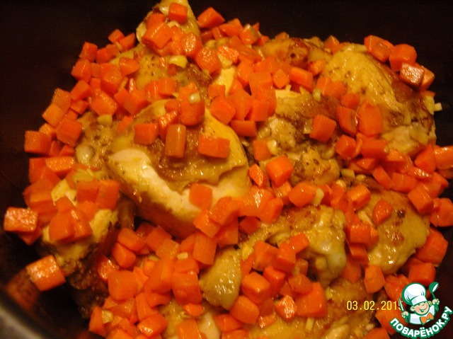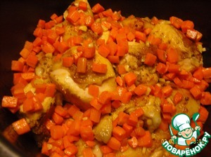 Морковь и чеснок нарезать кубиками, припустить в масле, в котором жарилась курица, переложить в казан на курицу