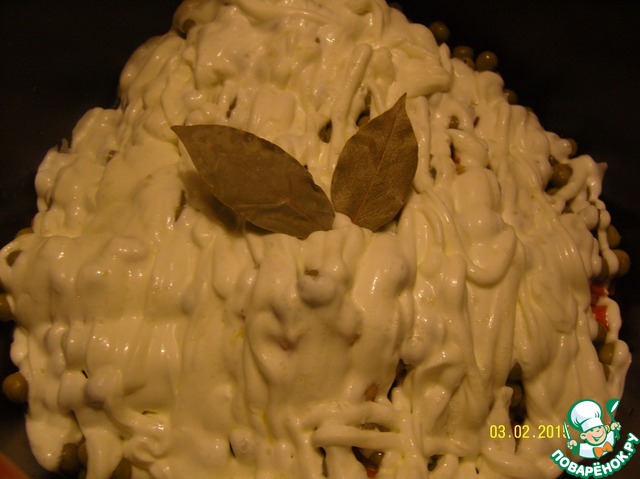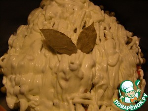 Полить сметаной, добавить 1-2 лавровых листа, подсолить по вкусу