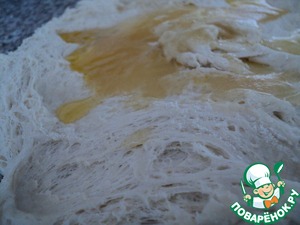 Добавляю оставшуюся муку, воду. Вымешиваю 2-3 минуты и оставляю на 30 минут на отлёжку ( аутолиз) при комнатной температуре. Затем добавляю отсдобку: растопленное сливочное масло ( в оригинальном рецепте нужно брать маргарин, но я считаю что сегодняшнее сливочное масло мало чем отличается от маргарина в прошлом), соль и сахар ( все перемешиваю в отдельной ёмкости и затем добавляю к тесту). Вымешиваю тесто не менее 20 минут руками ( ну нет у меня ни хлебопечки, ни комбайна, а имеющийся миксер может месить только омлет))).