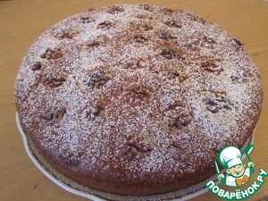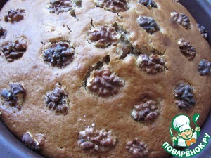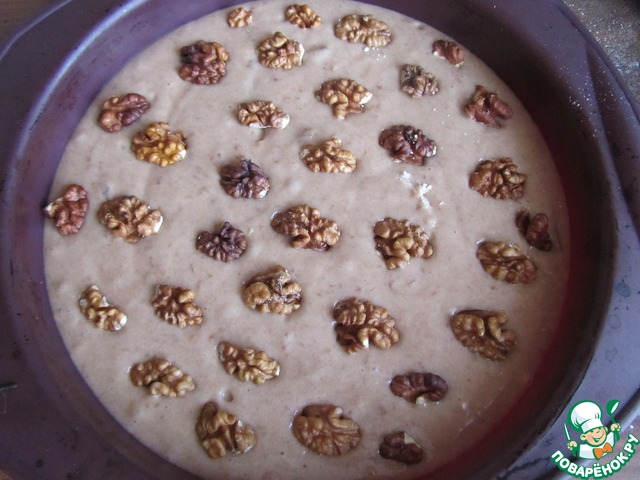 Вылить готовое тесто в форму для выпекания, и сверху выложить грецкие орехи.