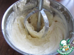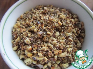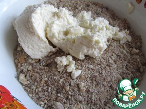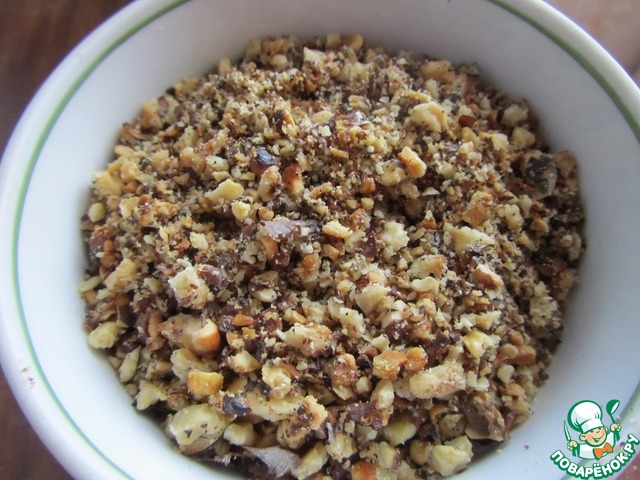 Крем тщательно перемешать с бисквитной крошкой и половиной грецких орехов.