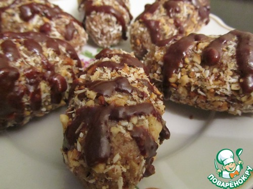 Остальную половину орехов смешать с кокосовой стружкой. Сформовать пирожные в виде картошки и обвалять в орешках с кокосом.