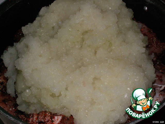 На 1 кг. мяса нужно 1 кг. лука и 1 ст. л. приправы.