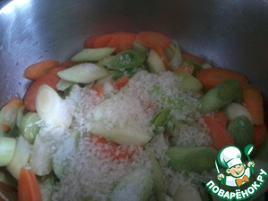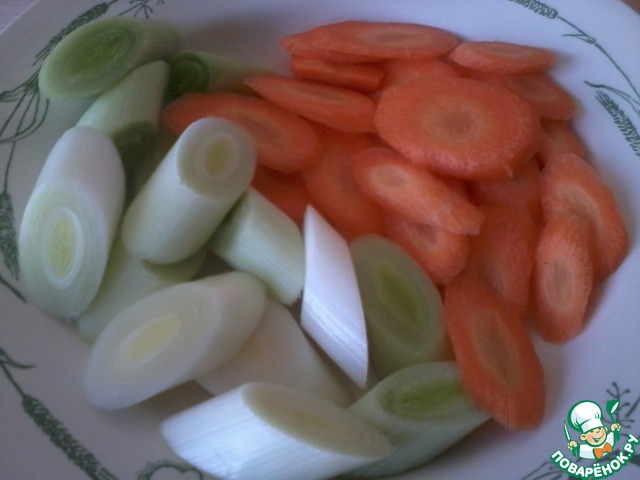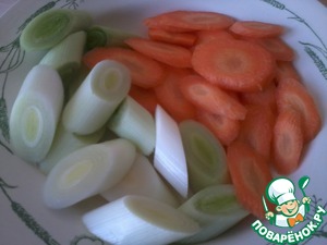 Все режем под углом на кольца, морковь средней толщины, лук-порей на части по 1,5 -2 см.