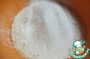 Добавляем растительное масло. По чуть-чуть всыпаем муку.