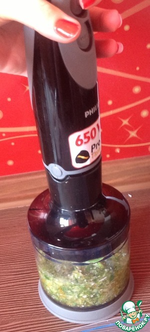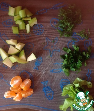 Зелень нашинковать, яблоко и сельдерей нарезать кубиками, мандарин разделить на дольки