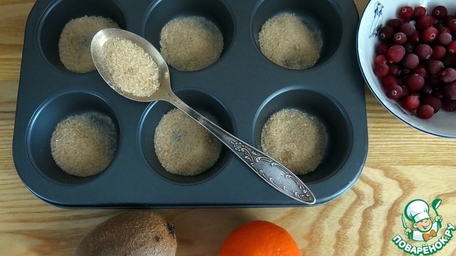 Далее подготовим формы. Их нужно смазать маслом (я забыла это сделать при первом наполнении, но кексы достала без проблем). И в каждую формочку насыпать около 1 ст. л. коричневого сахара. Можно обычный, если нет.