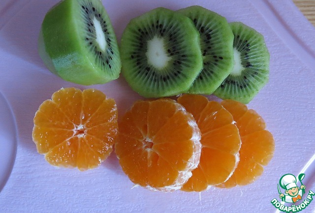 Очищенные фрукты нарезаем кольцами. У меня в этот раз - киви, мандарин и клюква.
