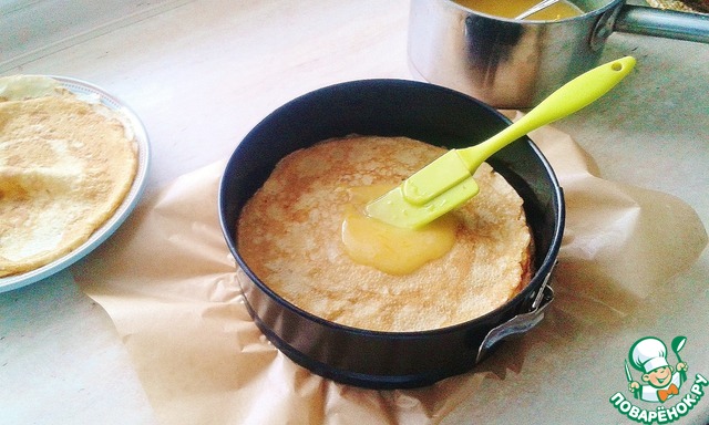 Так вот - дно формы застилаем пекарской бумагой и укладываем блины, промазывая каждый 2 ст. л. крема. Промазываем все блинчики, кроме ПОСЛЕДНЕГО, который будет "парадным", верхним блинчиком - для этого из стопки выбирайте самый красивый! -