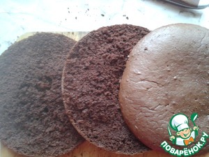Бисквит вынимаем из духовки, когда немного остынет и из формы и разрезаем на три коржа