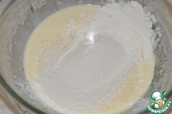 Затем ввести просеянную муку, аккуратно перемешать. -