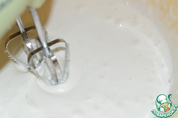 Желтки смешать с сахаром, ванильным сахаром и водой и взбить в светлую пышную массу.