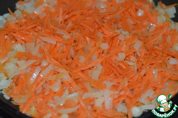 Обжарить лук до прозрачности, затем добавить морковь. Немного обжарить и добавить томатную пасту. Обжарить минутку и довести до вкуса солью, перцем и сахаром. -