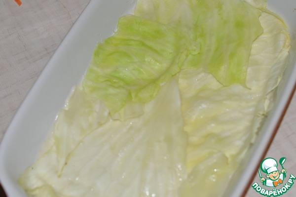 На дно формы для запекания выложить немного соуса, сверху капустные листья. Это могут быть не целые листья, а кусочки. -
