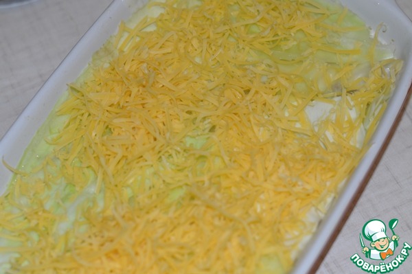 Затем листы капусты. Сверху листы посыпать тертым сыром.