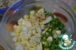 Начинку делала на глаз. Чуть больше яиц вареных, сырых, растопленного сливочного масла и риса( у меня был обыкновенный рис) И лука то же. ( Перерастал на балконе, надо было уже убирать)
